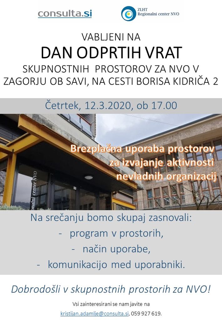 Nevladne organizacije iz zasavske regije, ki imate interes po brezplačni uporabi prostora, vabimo, da se nam javite na kristijan.adamlje@consulta.si ali na telefonsko številko 05927619.