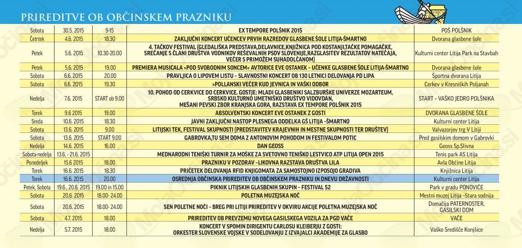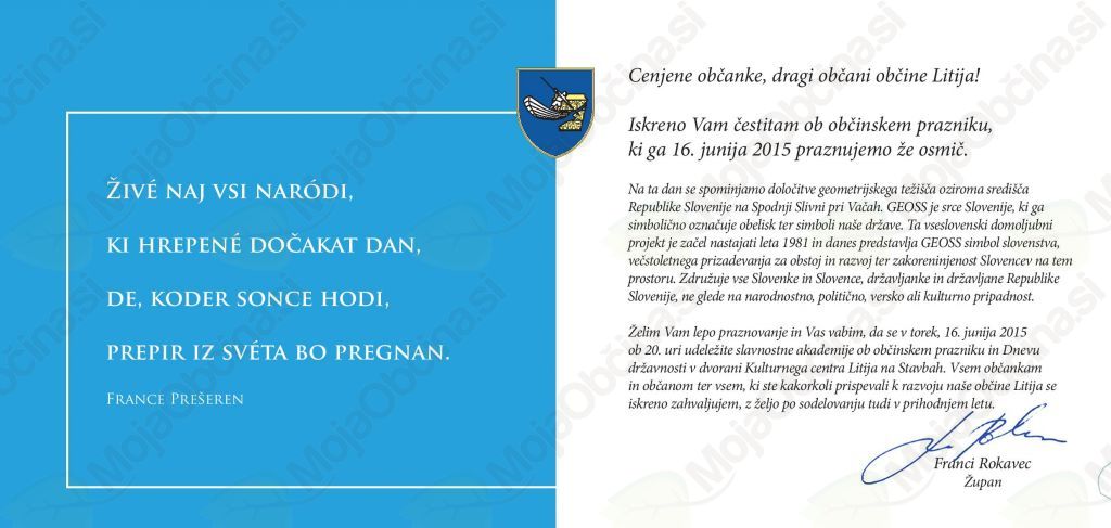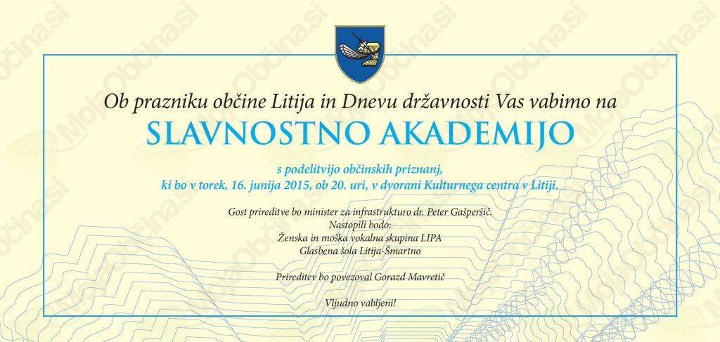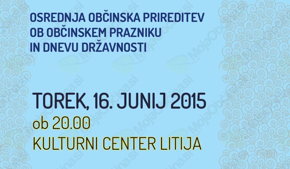 Ob prazniku naše občine vas vabimo na OSREDNJO OBČINSKO PRIREDITEV OB OBČINSKEM PRAZNIKU IN DNEVU DRŽAVNOSTI, ki bo v TOREK, 16. JUNIJA 2015, OB 20. URI v Kulturnem centru Litija.