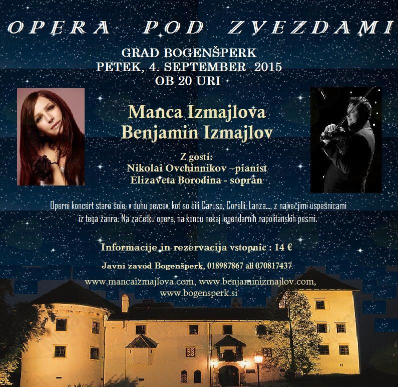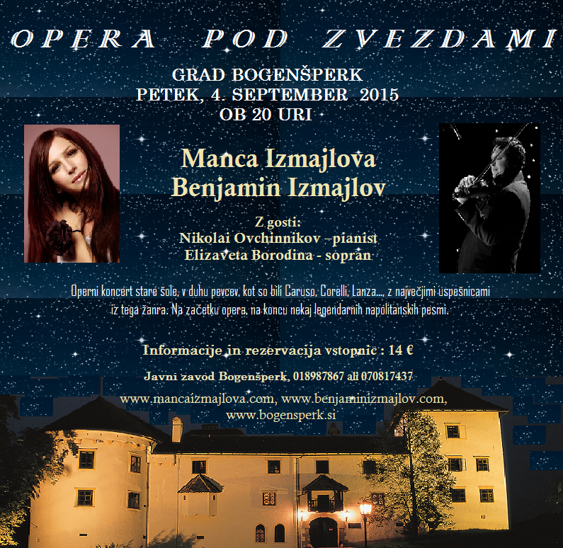Koncert, na katerem boste v prelepih izvedbah slišali znamenite operne in operetne arije, duete, ter virtuozne violinske bisere. Cena vstopnic 14. eur. Rezervacija vstopnic v JZ Bogenšperk: 01 8987867 ali na info@bogensperk.si, prodaja uro pred koncertom na gradu Bogenšperk.