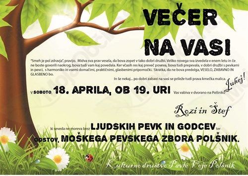 soboto, 18. aprila, ob 19. uri Vas vabiva v dvorano na Polšniku