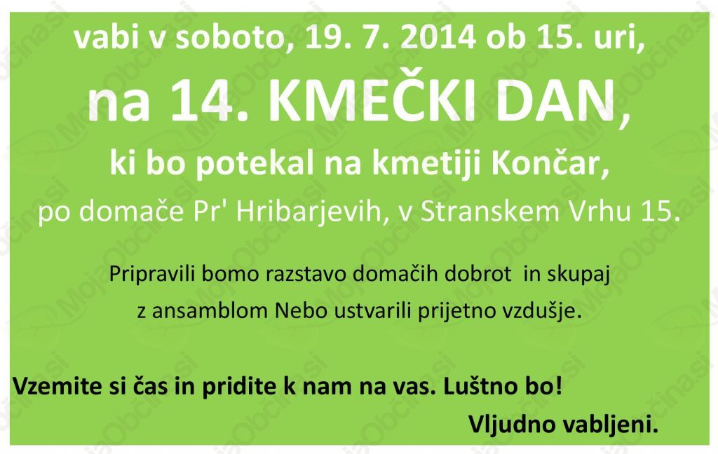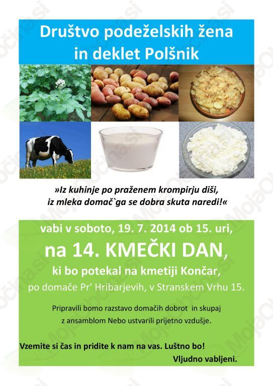 Društvo podeželskih žena in deklet Polšnik vabi v soboto, 19. 7. 2014, ob 15. uri na 14. KMEČKI DAN »Iz kuhinje po praženem krompirju diši, iz mleka domač`ga se dobra skuta naredi!«, ki bo potekal na kmetiji Končar, po domače Pr' Hribarjevih v Stranskem Vrhu 15 - Sušje.