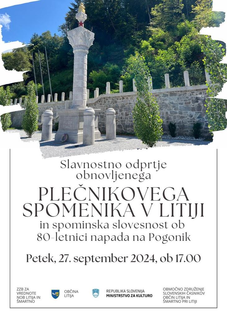 Prijazno vabljeni na slavnostno odprtje obnovljenega Plečnikovega spomenika v Litiji in spominsko slovesnost ob 80-letnici napada na Pogonik, ki bo v petek, 27. 9. 2024, ob 17. uri, na Trgu svobode v Litiji.