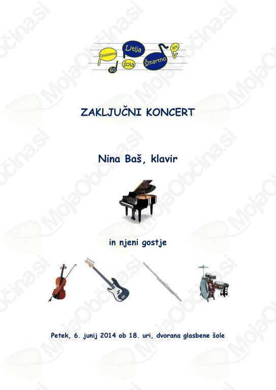 V petek, 6. junija 2014 ob 18. uri, vabljeni na Absolventski koncert Nine Baš (klavir) in njenih gostov v dvorano glasbene šole.