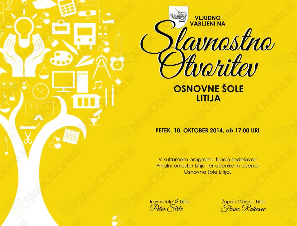Župan občine Litija in ravnatelj Osnovne šole Litija vabita na slovesno otvoritev nadomestne Osnovne šole Litija v petek, 10. oktobra 2014, ob 17.00 uri.