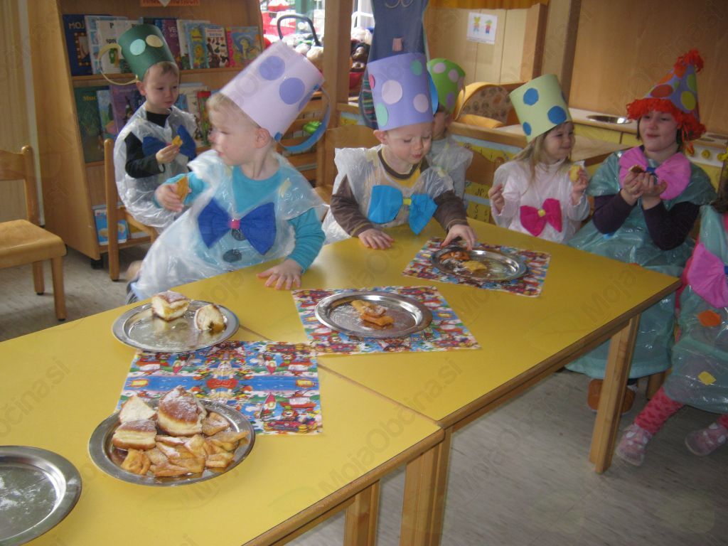 Po preganjanju zime so se maškare mastile z velikimi marmeladnimi krofi ter krhkimi flancati, ki so jih pikapolonice spekle v vrtcu.
