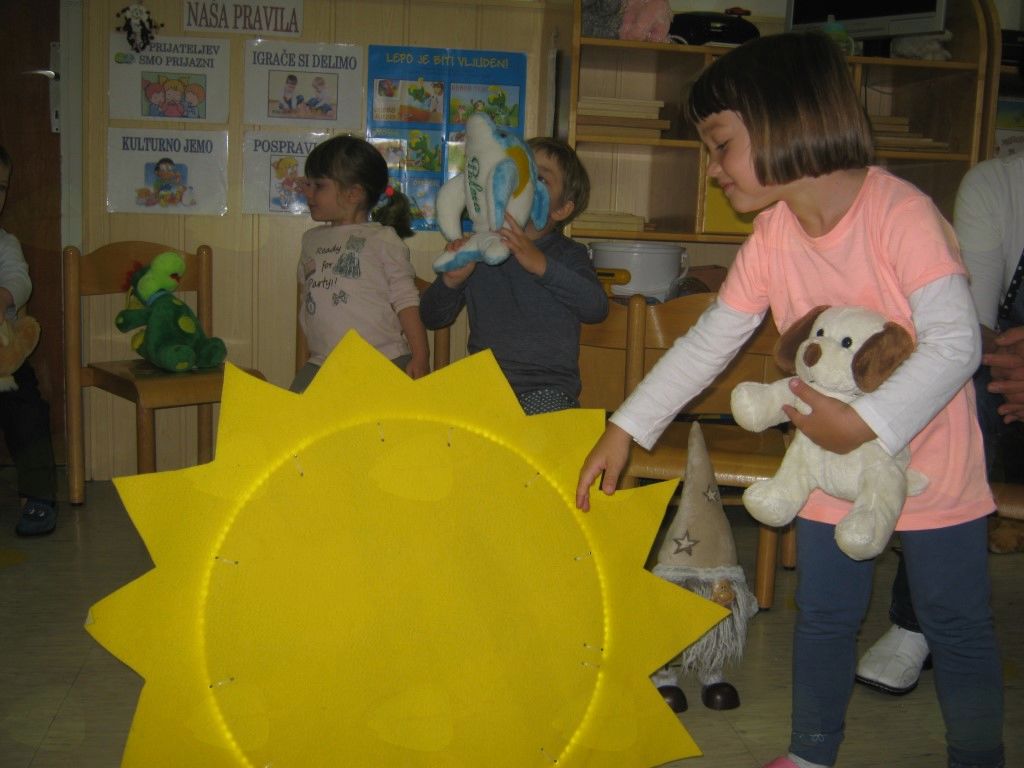 Teden dni prej so obiskali knjižnico, kjer so si izposodili veliko knjig s pravljicami o soncu, ki so jih prebirali vsak dan. Vsaka je prinesla neko pozitivno sporočilo in jih napeljala na pogovor in razmišljanje o lepem, boljšem, pozitivnem … Prvi dan v tednu jih je obiskalo sonce in jim za vsak dan pripravilo presenečenje. Naučilo jih je pesem »V vrtcu sonček nas poišče«, plesali so poseben ples s soncem velikanom, za vsakega otroka je sonce prineslo ljubkovalno igračo, s katero so otroci plesali, jo uspavali, šli z njo k počitku in jo ob koncu dneva  odnesli domov. Srečali so se z oddelki  vrtca na »Sončkovi olimpijadi«. Žalostno sonce, ki opazuje neodgovorno ravnanje zemljanov, so  s spravili v dobro voljo. Z nalogami, ki so izpostavljale pozitivne vrednote in ekološko ozaveščenost, je sonce zasijalo v vsej veličini. Za zaključek tedna so vzgojiteljice otrokom odigrale še igrico »Sonce gre na potep«. Otroci so ponovno dobili sporočilo, kako pomembno je sonce in kakšno energijo oddaja.