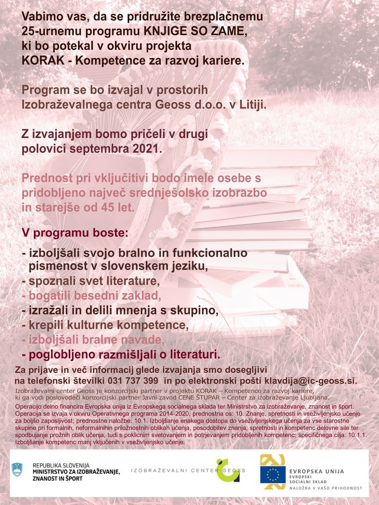 Program KNJIGE SO ZAME je namenjen vsem, ki bi želeli izboljšati razumevanje slovenskega jezika. V programu bomo krepili funkcionalno in bralno pismenost. Urili se bomo v rabi slovenskega jezika v vsakdanjem življenju in spodbujali branje leposlovja v slovenskem jeziku. Ob prebranih besedilih bomo razmišljali o kulturnem pomenu slovenskega jezika. Krepili bomo kritično razmišljanje in govor v slovenskem jeziku ter se posvetili pomenu in veljavi posameznikovega lastnega razmišljanja in doživljanja prebranega besedila ter okolja, kjer bivajo. Spodbujali bomo medkulturni in medgeneracijski dialog.