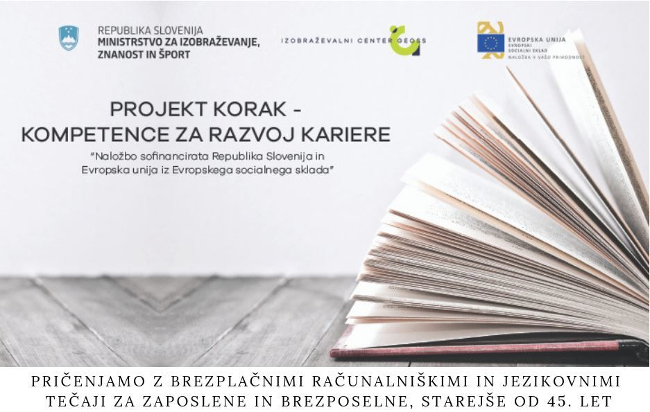 V okviru projekta »KORAK – Kompetence za razvoj kariere«, ki ga sofinancirata Republika Slovenija, Ministrstvo za izobraževanje, znanost in šport in Evropska unija iz Evropskega socialnega sklada, pripravljamo tudi druge brezplačne programe, zato vas vabimo, da nas spremljate na naši spletni strani www.ic-geoss.si in naši FACEBOOK strani.