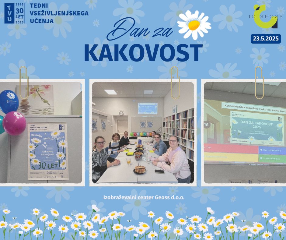 23. maja 2025 smo na Izobraževalnem centru Geoss d.o.o. izvedli Dan za kakovost 2025, ki je umeščen v promocijo vseživljenjskega učenja TVU – Tedni vseživljenjskega učenja.