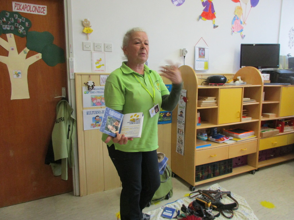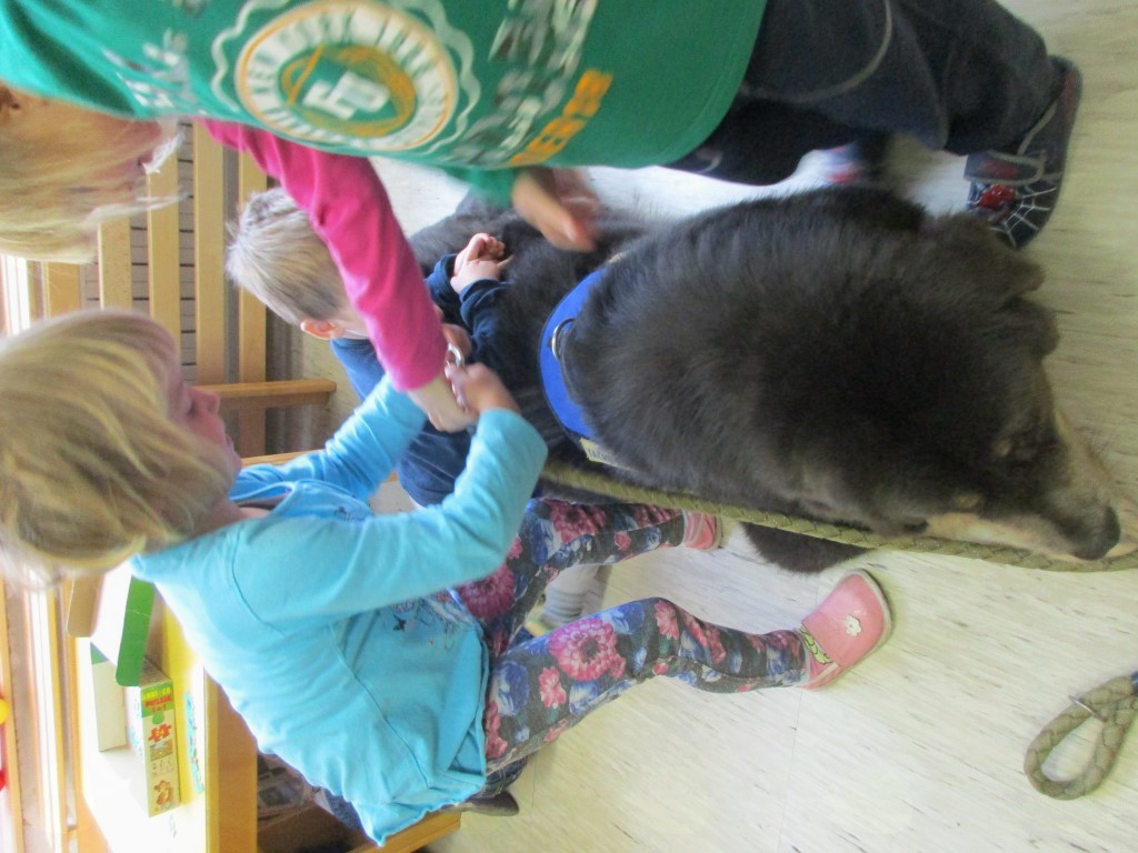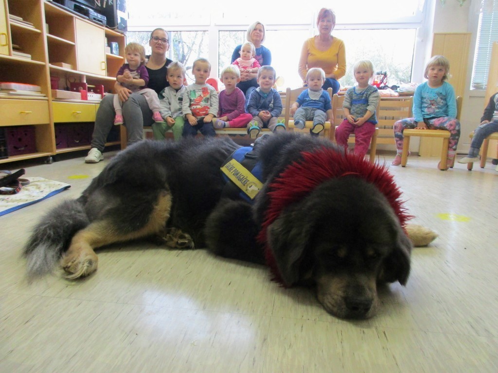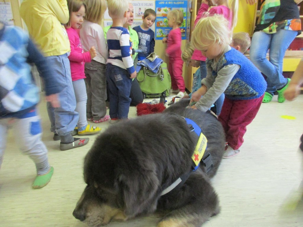 V ponedeljek, 10. 10. 2016, so z veliko nestrpnostjo čakali gospo Lubko, ki jim je obljubila obisk s svojim psom. Oba sta člana Slovenskega društva za terapijo s psi »Tačke pomagačke«. Pričakovali so ju namreč že pred tednom dni, ko je bil dan živali, pa so nastopile objektivne razmere. Ko je gospa Lubka vstopila kozi vrata igralnice s svojim velikim kosmatincem Kalom, so otroci, pa morajo priznati, da tudi vzgojiteljice, kar malce otrpnili, še zlasti, ko jih je Kal začel ovohavati. A to ni trajalo dolgo. Hitro je strah minil in bili so sproščeni. Kal je bil že njihov. Začela se je zabava. Kala so lahko božali, mu pripenjali povodec, največ pa so imeli dela s česanjem z različnimi glavniki in krtačami. Naučili so se, kako reagirati, ko do njih pristopi neznan kuža. Skupaj so premagali strah pred velikim psom in spoznali, kako zna biti pes prijazen, ljubezniv, potrpežljiv … Vse te lastnosti bi želeli, da jih imajo tudi ljudje.