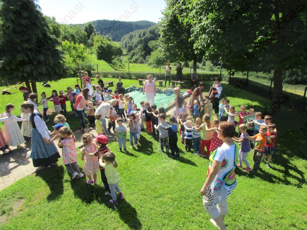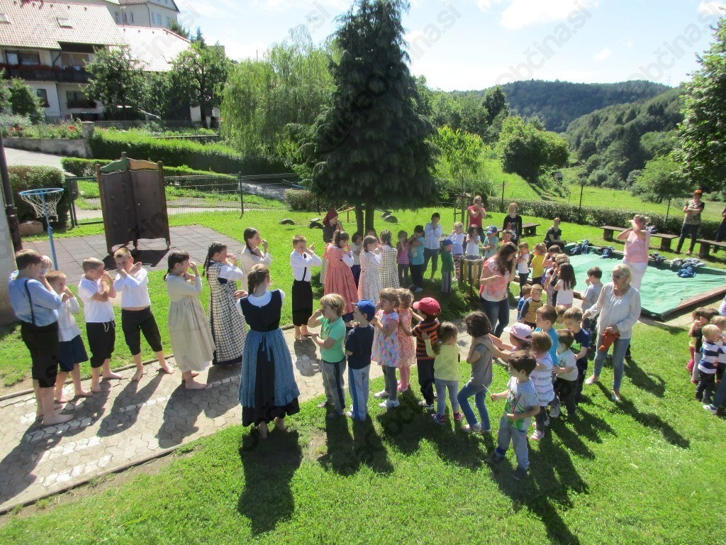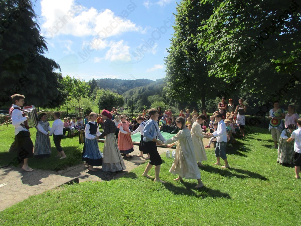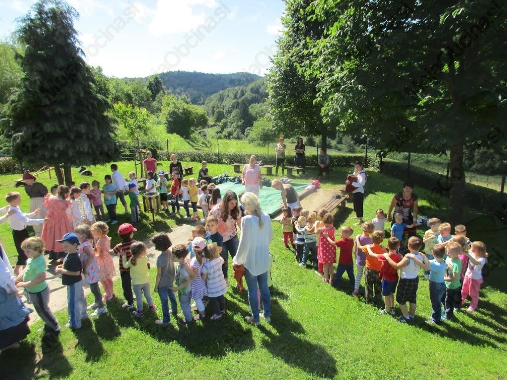 V uvodnem delu so lahko prisluhnili prepevanju ter plesu ljudskih pesmi in igranju ljudskih iger. Predstavil se je tudi mali harmonikaš, še vrtičkar. Njihov nastop jih je zelo navdušil. Sledila je plesna delavnica plesnih ljudskih iger, v katero so se vključili vsi otroci oddelkov iz Gabrovke in oddelek »Petelinčkov« iz Šmartnega. V nadaljevanju je sledila še manjša pogostitev, druženje na igrišču, igra na igralih in v peskovniku. Bili so kot sončki, polni pozitivnee energije, povezovala jih je dobra volja, prijateljstvo, ples in pesem. Pavčkova pesem, ki so jim jo podarili »Petelinčki« kar drži.