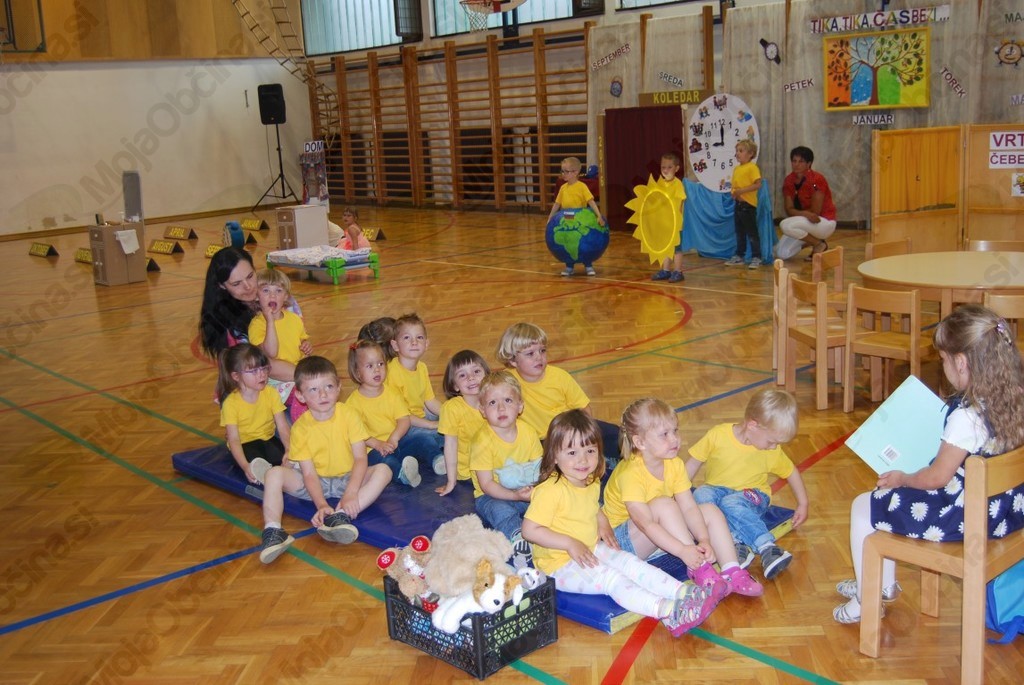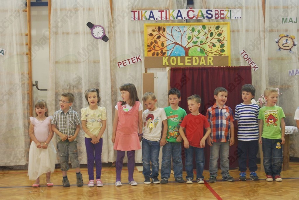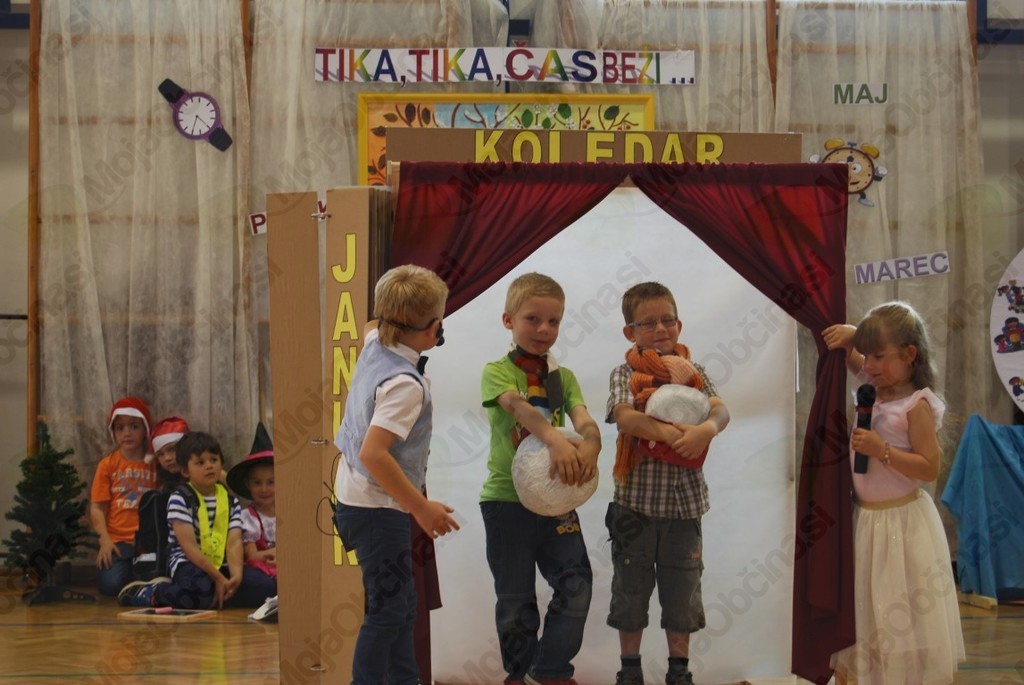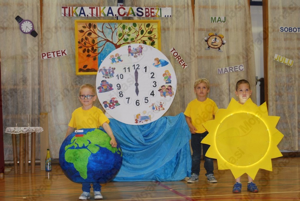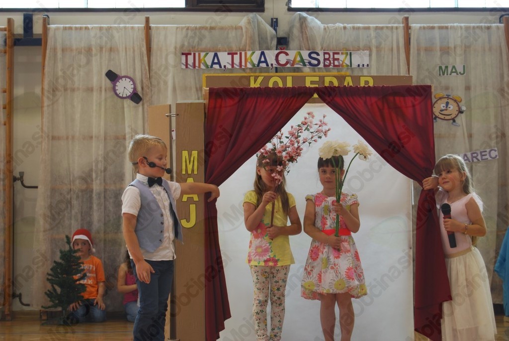 Res beži, še ne dolgo nazaj so nekateri prvič vstopili v vrtec, skupaj premagovali prve korake uvajanja. Pa je že tu konec leta in njihov zaključek. Koliko novega znanja so vsrkale njihove glavice. To so lahko videli tudi vsi obiskovalci na njihovi zaključni prireditvi, »Tika, taka, čas beži…«. Rdeča nit prireditve je bila povezana z njihovim letošnjim prednostnim področjem »Porajajoča se pismenost«. Skozi uro in pol dol program so prikazali, kaj vedo o času, kako se v njem orientirajo in kako uresničujejo cilje iz področja zgodnje porajajoče se pismenosti na področju naravoslovja. Vsaka od skupin je prikazala eno časovno obdobje: dan in ure, dnevi v tednu, meseci v letu in skupna točka letni časi. Od najstarejših vrtičkarjev so se tudi slovesno poslovili.