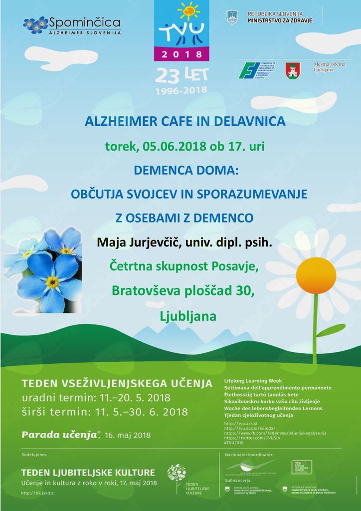 V okviru Tedna vseživljenjska učenja 2018 vas vabimo na Alzheimer Cafe in delavnico, ki bo v torek, 5. junija 2018 ob 17. uri v prostorih Četrtne skupnosti Posavje, Bratovševa ploščad 30, Ljubljana.