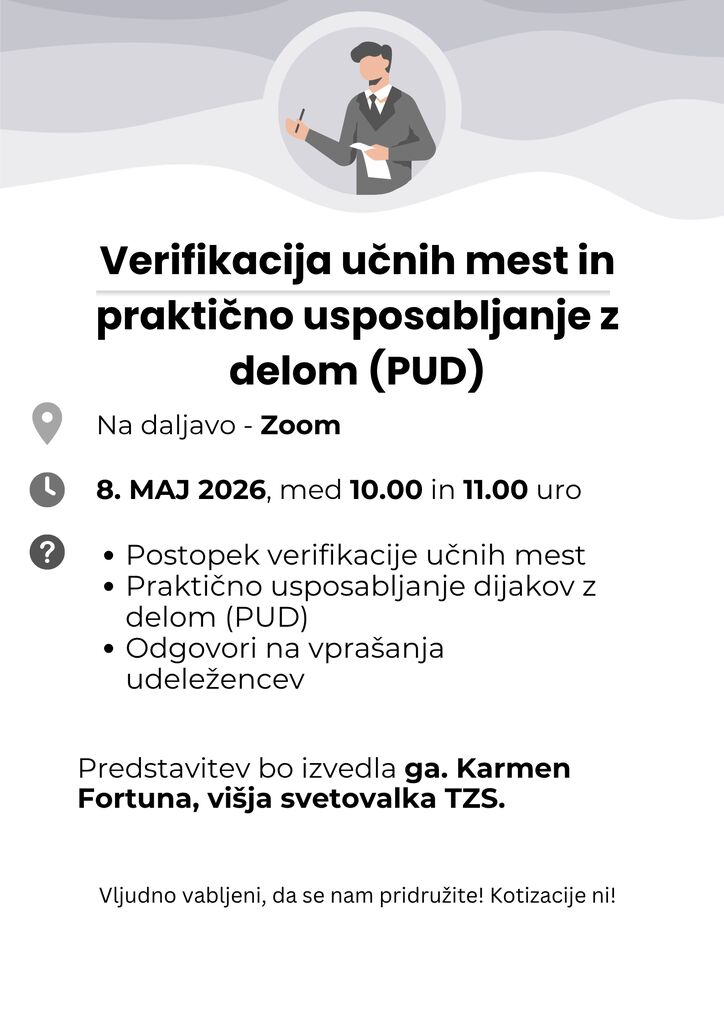 Vljudno vabljeni, da se nam pridružite na brezplačnem webinarju "Verifikacija učnih mest in praktično usposabljanje z delom (PUD)", ki bo potekal dne 8. 5. 2026 med 10.00 in 11.00 uro, preko platforme ZOOM.