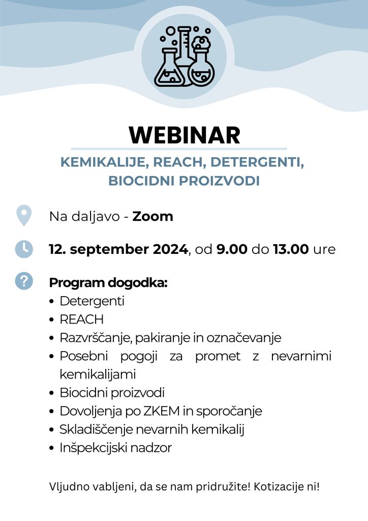 Vljudno vas vabimo na brezplačni webinar za trgovce: KEMIKALIJE, REACH, DETERGENTI, BIOCIDNI PROIZVODI, ki bo potekal 12. 9. 2024 od 9.00 do 13.00 ure preko platforme ZOOM.