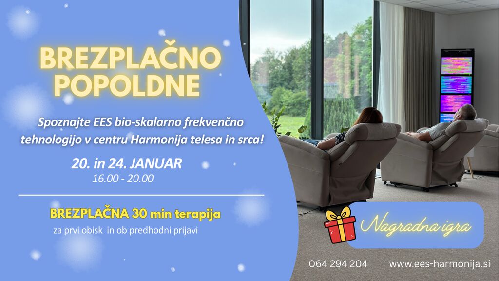 BREZPLAČNO POPOLDNE V NAŠEM CENTRU ✨ Si želite preizkusiti eno najsodobnejših frekvenčnih tehnologij na svetu? V našem centru omogočamo BREZPLAČNO 30-minutno izkušnjo EES bio-skalarne tehnologije 🧬, namenjeno vsem novim obiskovalcem. Vabljeni v torek, 20. 1., in sobota, 24. 1. med 16.00 in 20.00 Kaj vas čaka? POSEBNA UGODNOST - Eden izmed članov naše ekipe praznuje v tednu dogodka rojstni dan in vam podarja: • 50 % popust na dnevne terapije • 35 % popust na nočne terapije 📩 Prijave: 📍 Kje? 💙 Ekipa Harmonija telesa in srca vas z veseljem pričakuje!