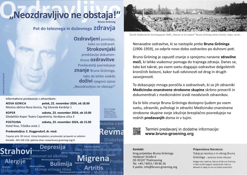 Lepo vas vabimo na serijo informativnih uvodnih predavanj na temo;" Pot do telesnega in duševnega zdravja po Učenju Bruna Groeninga."