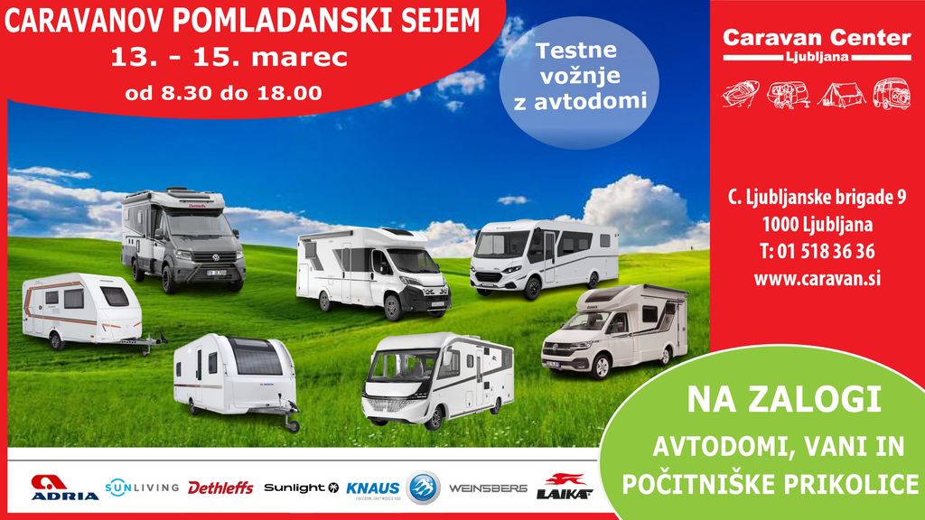 Caravan center Ljubljana je zastopnik za številne znamke avtodomov in počitniških prikolic. Tako bodo na ogled novi modeli avtodomov in vani znamk Dethleffs, Weinsberg, Knaus, Adria, Sunliving, Laika in Sunlight.