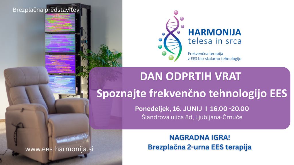 Vabimo vas na Dan odprtih vrat našega centra Harmonija telesa in srca, kjer bomo predstavili delovanje EES-tehnologije (Energy Enhancement System) ter delček izkušnje, ki jo ta tehnologija ponuja. Obiskovalcem bo omogočen tudi krajši brezplačen preizkus, ogled prostora ter osebno svetovanje.