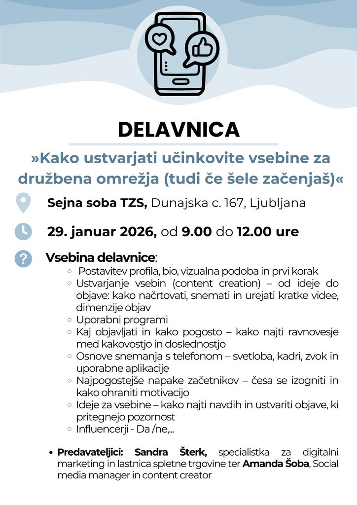 Vljudno vabljeni, da se nam dne 29. 1. 2026 med 9.00 in 12.00 uro, v sejni sobi TZS pridružite na delavnici »Kako ustvarjati učinkovite vsebine za družbena omrežja (tudi če šele začenjaš)«.