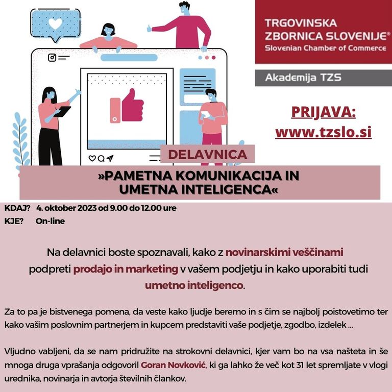 Vljudno vabljeni, da se nam pridružite na delavnici "Pametna komunikacija in umetna inteligenca", kjer boste spoznavali, kako z novinarskimi veščinami podpreti prodajo in marketing v vašem podjetju in kako uporabiti tudi umetno inteligenco. Za to pa je bistvenega pomena, da veste kako ljudje beremo in s čim se najbolj poistovetimo ter kako vašim poslovnim partnerjem in kupcem predstaviti vaše podjetje, zgodbo, izdelek …