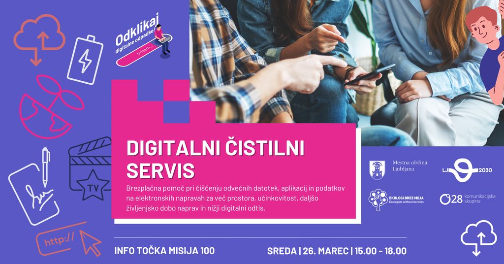 Vabljeni na družabni dogodek v sklopu akcije Odklikaj digitalne odpadke, kjer vam bodo s priporočili za učinkovito čiščenje in digitalno organizacijo priskočili na pomoč Ekologi brez meja. Prinesite svoje elektronske naprave (mobilni telefon, prenosni računalnik, tablica). Skupaj se bomo poglobili v svet digitalne nesnage in hkrati poskrbeli za nižji digitalni odtis, ki negativno vpliva na naše okolje.