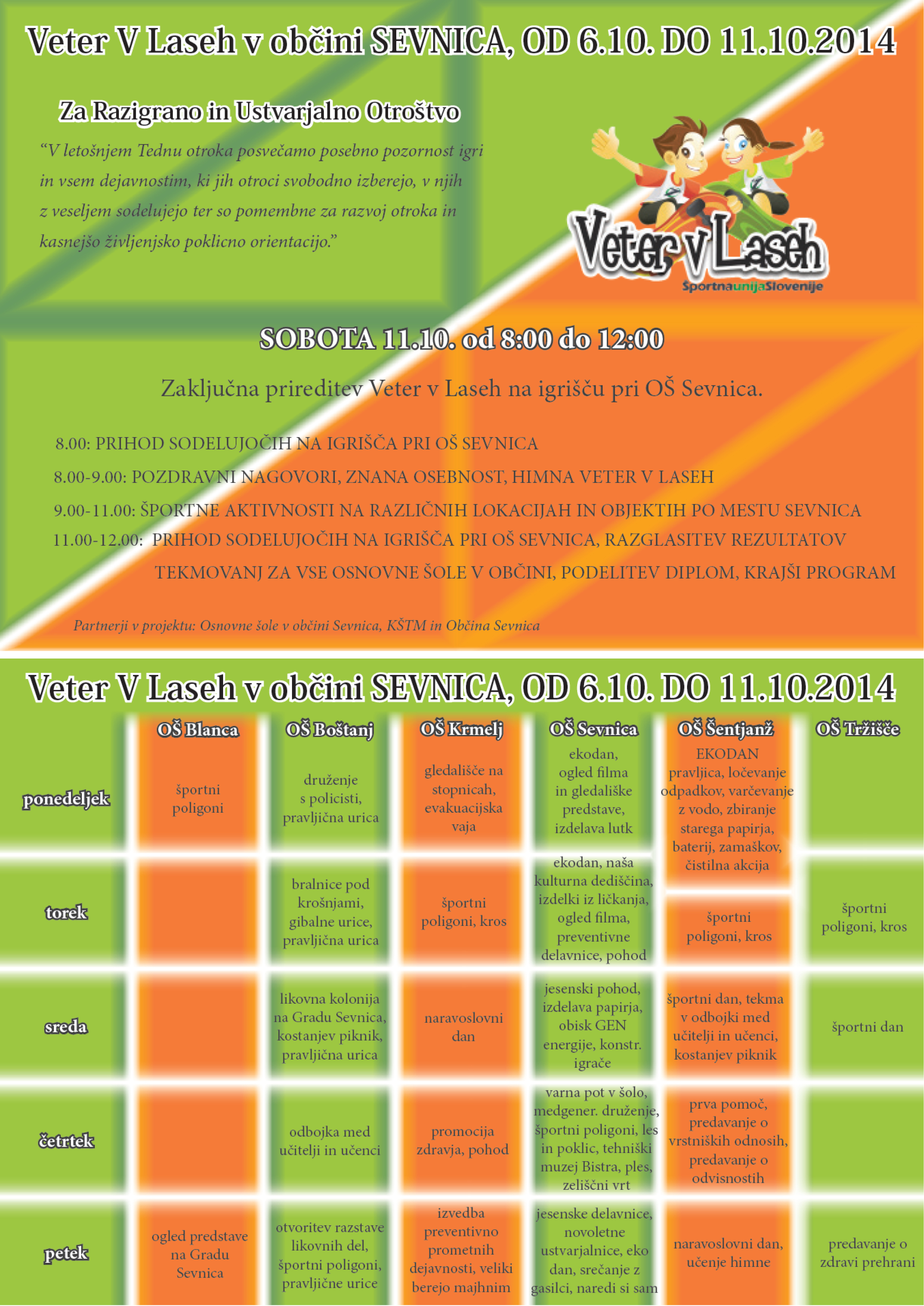 V soboto, 11.10. bo v Sevnici potekal zaključni festival športno družbene akcije Veter v laseh. Sobotna prireditev bo zaključek celotedenske akcije Veter v laseh, ki se v Sevnici odvija v času Tedna otroka (6.10. – 12.10.2014).