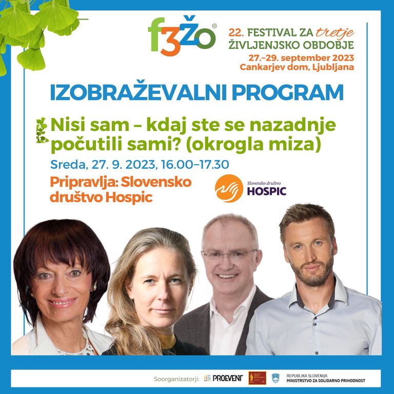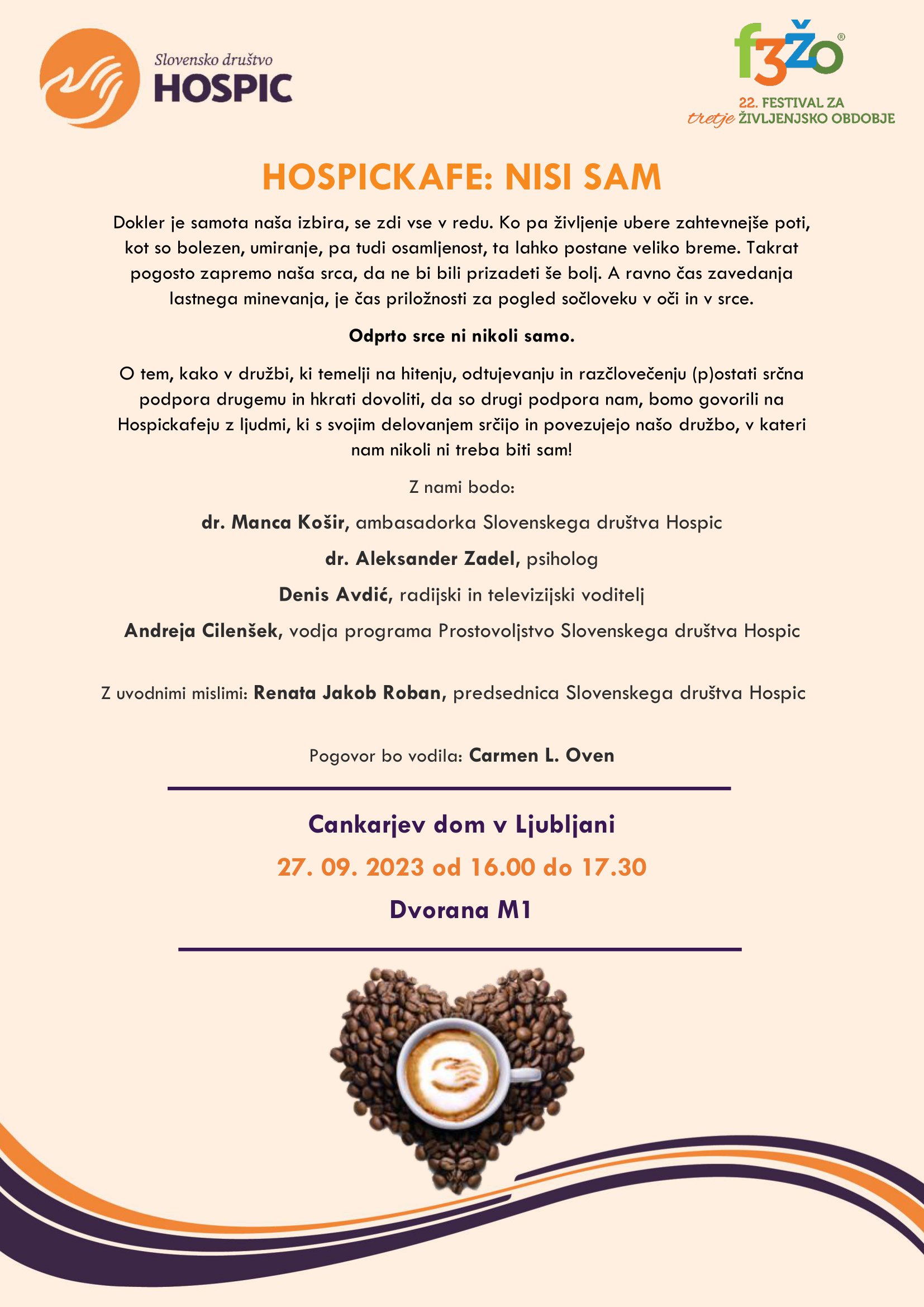 Prisrčno vabljeni na Hospickafe NISI SAM - KDAJ STE SE NAZADNJE POČUTILI SAMI?, v sredo 27. 9. 2023 ob 16. uri, v dvorani M1 v Cankarjevem domu na letošnjem Festivalu za tretje življenjsko obdobje!