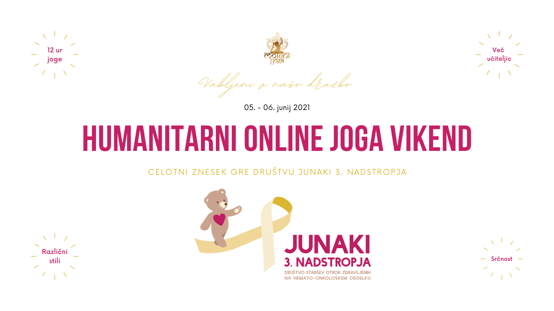 Dobrodelni jogijski oddih v družbi izjemnih učiteljic joge. Celotni znesek gre v podporo Društvu Junaki 3. nadstropja. To je društvo staršev otrok, obolelih za rakom. V njihovem prikrajšanem otroštvu jim lahko sedaj pomagamo tudi mi. Društvo z izkušnjami in voljo nudi oporo tudi družinam, ki stopajo po poti, katero so prehodili sami. Organizirajo različne projekte. Znesek, pa bo v našem primeru šel za program: “Polepšajmo otrokom bivanje na oddelku”.