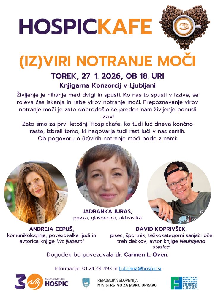 Življenje je nihanje med dvigi in spusti. Ko nas to spusti v izzive, se rojeva čas iskanja in rabe virov notranje moči. Prepoznavanje virov notranje moči je zato dobrodošlo še preden nam življenje ponudi izziv! Zato smo za prvi letošnji Hospickafe, ko tudi luč dneva končno raste, izbrali temo, ki nagovarja tudi rast luči v nas samih. Ob pogovoru o (iz)virih notranje moči bodo z nami: JADRANKA JURAS, ANDREJA CEPUŠ, DAVID KOPRIVŠEK.