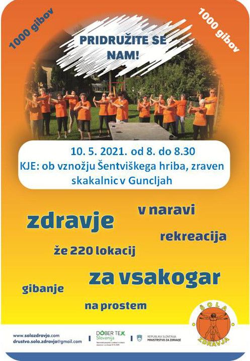 Člani Društva Šola zdravja, z redno in zmerno telesno dejavnostjo, preventivno in pozitivno vplivamo na svoje zdravje. Začeti dan z gibanjem pomeni, da naš vsakdan obogatimo z dobro voljo in vadbo v dobri družbi. Vedno se dobivamo zunaj, na prostem, na varni razdalji, kar je še posebej zaželeno v času epidemije. V pol ure razgibamo vse mišične skupine in sklepe od dlani do podplatov. Vsakodnevno 30 minutno razgibavanje na dan priporoča tudi svetovna zdravstvena organizacija. Vadeči ne potrebujejo posebnih pripomočkov, vaje se izvajajo stoje in so enostavne. Pridite in se prepričajte v naš že 12 let star recept – “1000 gibov”.
