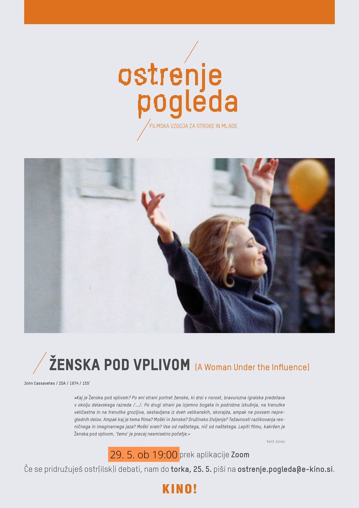 vabljeni na devetnajsto srečanje izrednega spletnega krožka, ki bo potekalo v soboto, 29. maja ob 19:00 na aplikaciji Zoom. Po prejšnji debati o filmu Obrazi (Faces, 1968) se bomo tudi tokrat pogovarjali o mojstrovini Johna Cassavetesa, in sicer o Ženski pod vplivom (A Woman Under the Influence, 1974).