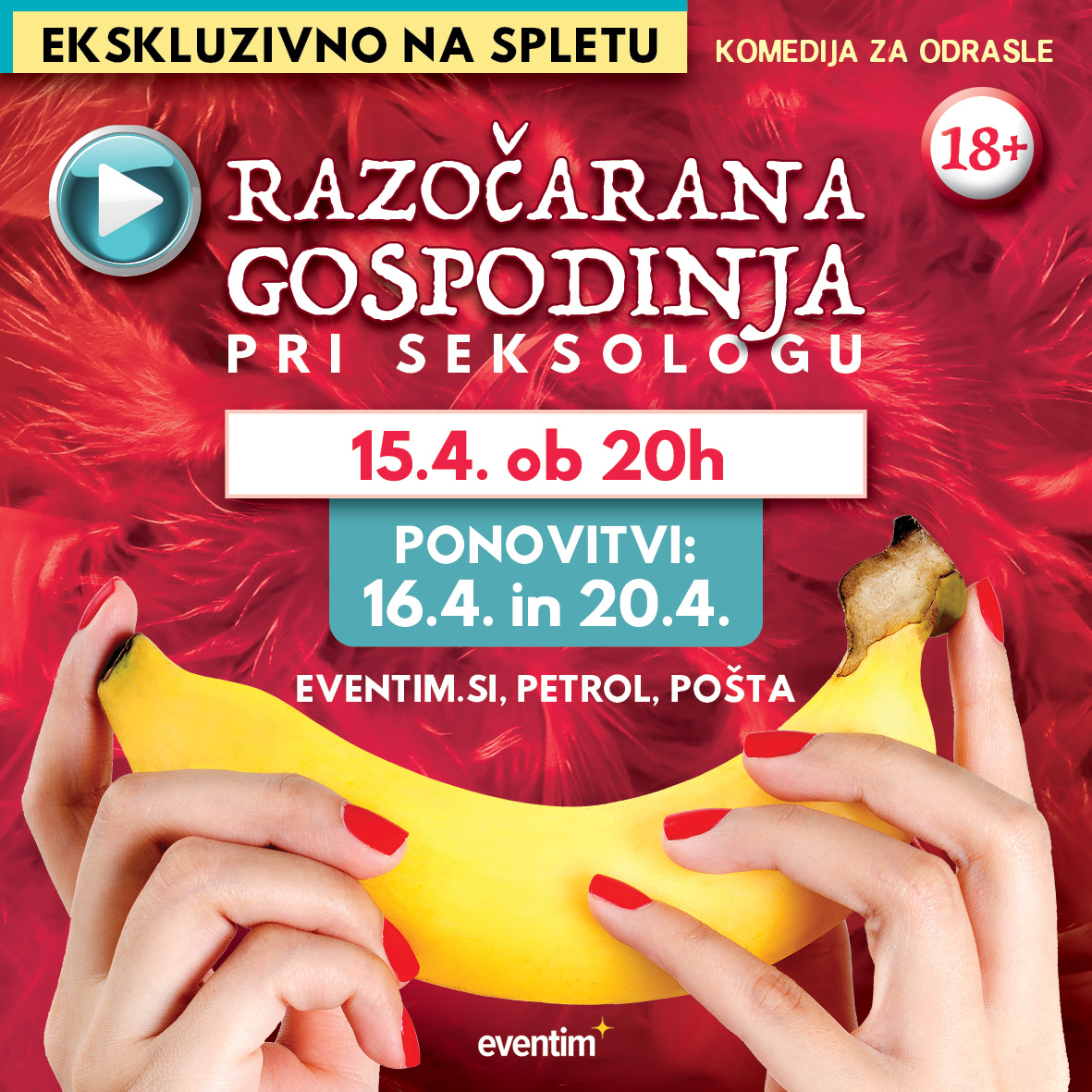 Premierno na spletu - velika slovenska gledališka uspešnica - Razočarana gospodinja pri seksologu. V treh terminih: 15.4., 16.4. in 20.4.