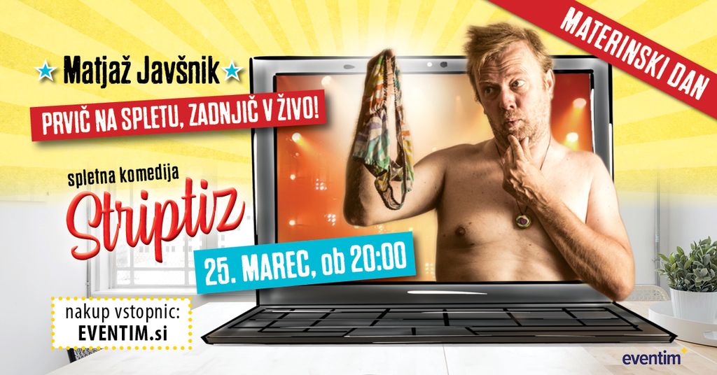 Zaradi izjemnega zanimanja in na posebno željo občinstva, Matjaž Javšnik ponovno in nepreklicno zadnjič na spletnem odru z zdaj že ponarodelo komedijo Striptiz. In to prav na materinski dan.