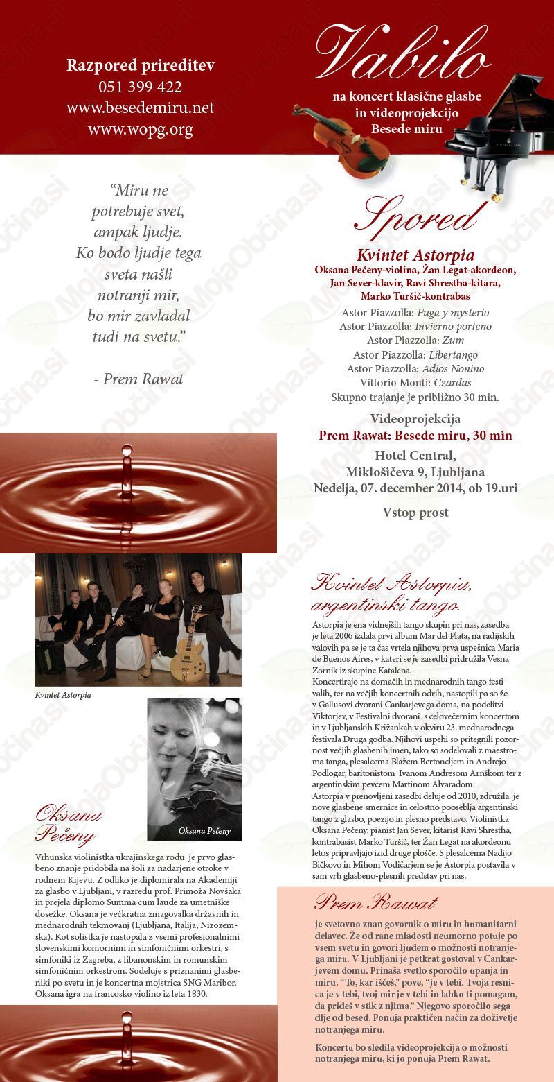 Koncert Klasične glasbe s Kvintetom Astorpia in Videoprireditev Besede miru