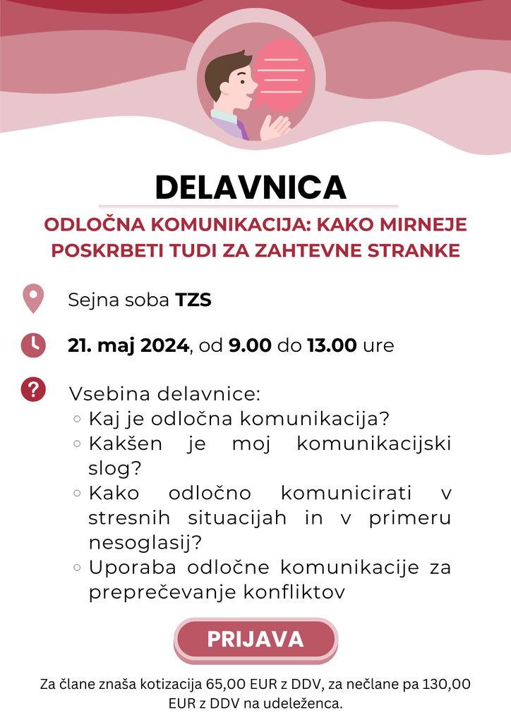 Vljudno vas vabimo na delavnico »Odločna komunikacija: kako mirneje poskrbeti tudi za zahtevne stranke«, ki bo potekala dne 21. 5. 2024 od 9.00 do 13.00 ure v sejni sobi TZS.