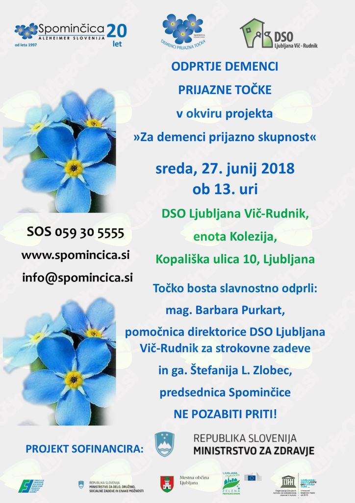 vabimo vas na odprtje Demenci prijazne točke, ki bo v sredo, 27.06.2018, ob 13. uri, v DSO Ljubljana Vič-Rudnik, enota Kolezija, Kopališka ulica 10, Ljubljana.
