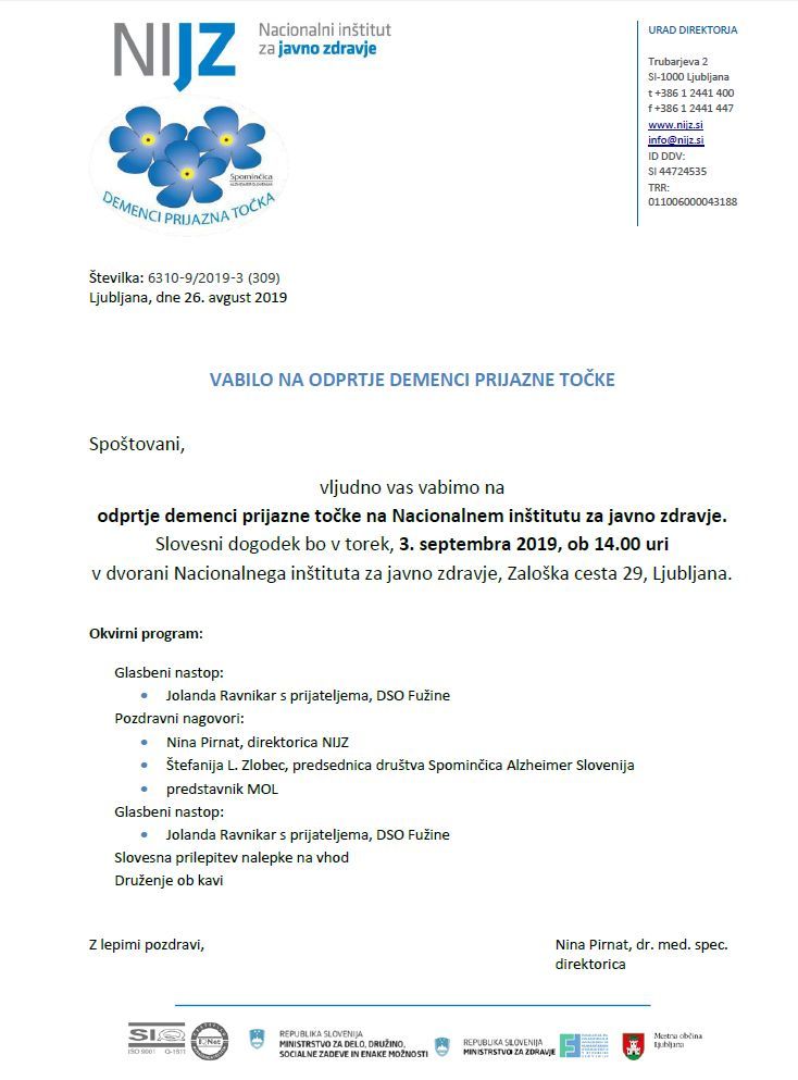 Spominčica – Alzheimer Slovenija vabi na odprtje Demenci prijazne točke na Nacionalnem inštitutu za javno zdravje, ki bo v torek 3.9.2019 ob 14. uri, v dvorani Nacionalnega inštituta za javno zdravje, Zaloška cesta 29, Ljubljana.