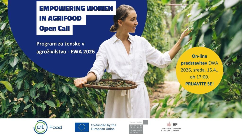 EIT Food bo v sodelovanju s CPOEF in Ekonomsko fakulteto Univerze v Ljubljani, ponovno izvajal program EWA – Empowering Women in Agrifood. Program bo podprl 10 podjetnic, ki jih zanima agroživilski sektor, pri razvoju njihovega podjetja ali podjetniške ideje. EIT Food je podprt s strani Evropskega inštituta za inovacije in tehnologijo (EIT), organa Evropske unije.