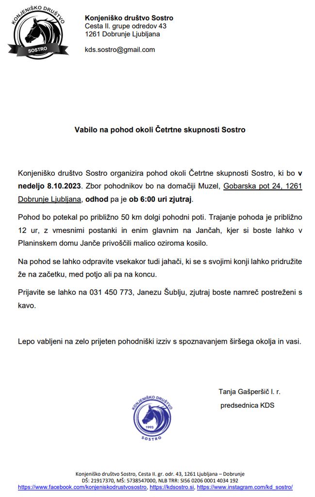 Konjeniško društvo Sostro vabi vse ljubitelje rekreacije in tudi dobro pripravljene jahače, ki se nam lahko pridružijo na zanimivem pohodu okoli Četrtne skupnosti Sostro.