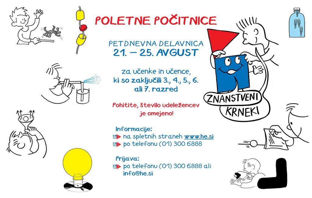 Znanstveni Krneki je delavnica, na kateri bodo vaši otroci sami naredili veliko zanimivih stvari, se zabavali med izdelavo eksperimentov, tekmovali in še več! Petdnevna delavnica Znanstveni Krneki bo potekala vsak dan od 21. do 25. avgusta med 9. in 14. uro. Hiša eksperimentov bo v tem času zaprta za zunanje obiskovalce. Delavnica je namenjena učenkam in učencem, ki so zaključili 3., 4., 5., 6. ali 7. razred.
