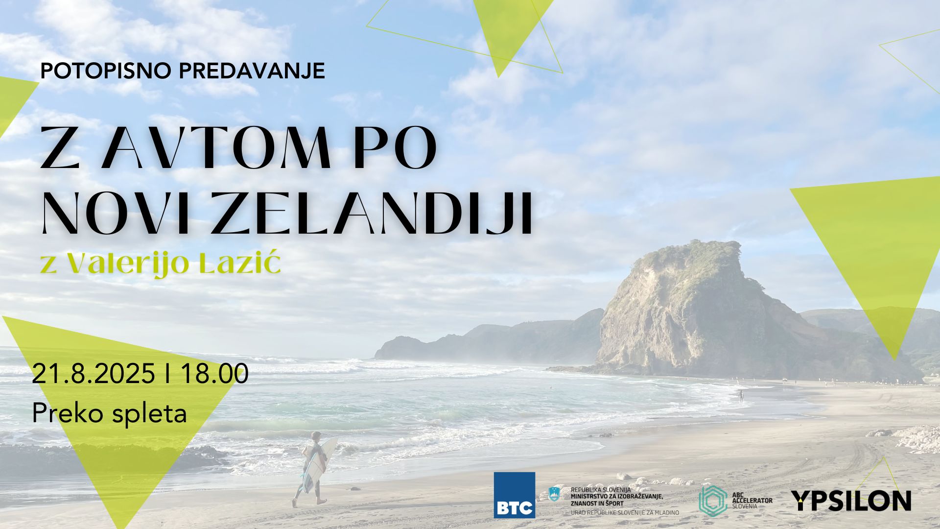 Si kdaj razmišljal_a, da bi Novo Zelandijo raziskoval_a kar z avtomobilom? Na predavanju "Z avtom po Novi Zelandiji" bomo skupaj odkrivali, zakaj je to ena najboljših odločitev za raziskovanje te čudovite države – ter kako potovanje organizirati brez stresa, a z največ izkušenj, doživetij in fotografij za spomine.
