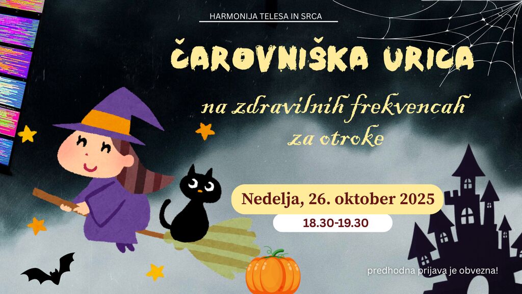 🕯✨ Pravljična urica na zdravilnih frekvencah v čarovniški preobleki ✨🕯 Noči so vedno daljše in ko se nad nas spusti tančica teme, iz senc pokukajo skrivnosti čarovniškega sveta. 🌙🔮 Vabimo vse male in velike čarovnice, čarovnike, coprnike in čarobna bitja, da se nam pridružijo na pravljični urici, kjer bomo skupaj odpotovali v skrivnostni svet čarovnice Mici, Maca in Manca. 🧙♀🐈⬛✨ Pridi našemljen, čarovniško razpoložen in pripravljen na pravljične čire-čare, saj nas čaka urica polna domišljije, smeha in čarobnih zgodb! 🧹🕸🌒 Vse to ob zdravilnih frekvencah EES bioskalarne tehnologije, ki bo naš imunski sistem medtem pripravila na zimo. Vstop v svet čarovnij je odprt... si upaš prestopiti mejo?✨🧚 Primerno za otroke od 4 do 10 let Nedelja, 26. oktober | 18.30–19.30 Cena: 35 € (otrok + 1 starš) | -50 % za drugega otroka Starši, dedki, babice, strici in tetke, vabljeni da pripeljete svoje malčke na čarovniško izkušnjo. 😊