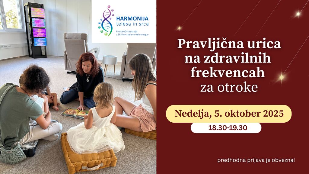 V nedeljo se zopet srečamo na pravljični urici. Poskrbite, da bo imunski sistem vašega malčka pripravljen na začetek novega šolskega leta! Za vas in vaše radovedne raziskovalce smo ustvarili nekaj res posebnega: BRALNA URICA v EES terapevtski sobi, kjer se svet domišljije prepleta z naravno podporo imunskemu sistemu. Ob poslušanju pravljic bodo otroci nežno obdani s frekvencami, ki spodbujajo regeneracijo telesa, pomirjajo živčni sistem in krepijo odpornost. Zakaj je to dragoceno? V času, ko se po vrtcih in šolah hitro širijo prehladi, viroze in druge okužbe, otroci potrebujejo dodatno zaščito. S pomočjo EES tehnologije bodo izpostavljeni okolju, ki deluje podporno – brez zdravil, brez neprijetnosti, popolnoma naravno. Medtem ko se potopijo v pravljični svet, njihovo telo prejema točno to, kar potrebuje za zdravje, rast in notranje ravnovesje. Primerno za vse otroke, še posebej za tiste, ki pogosto zbolevajo, so bolj občutljivi ali potrebujejo več miru. Kdaj: nedelja, 5.10.2025 ob 18:30 Starost: 4–10 let Cena: 35 € (otrok + starš) Popust: -50 % za drugega otroka Prijave: info@ees-harmonija.si ali 064 294 204