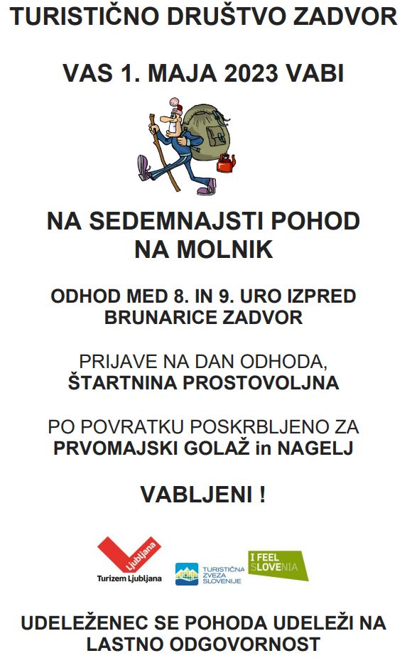 Lepo vabljeni na tradicionalni že 17. Prvomajski pohod na Molnik pri Ljubljani, ki ga vsako leto organizirata Turistično društvo Zadvor za vse pohodnike in Konjeniško društvo Sostro za vse konjenike.