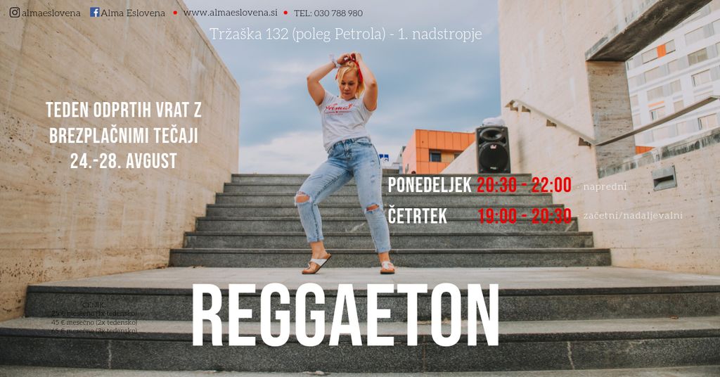 KAJ JE REGGAETON?Reggaeton je glasbeno plesni žanr, ki se je razvil v Latinski Ameriki, predvsem v Panami in Portoriku. Povezuje se z različnimi urbanimi plesnimi stili, kot so: hip hop, jamajški reggae in dancehall, afrobeat ter ostali afro-latinski ritmi. V zadnjem času je izjemno popularen tudi pri nas. Zanj je značilen ponavljajoč se ritem, ki hitro zasvoji. Gre za urbani ples, z veliko svobode, pomembno pa je, kako izvajamo gibe