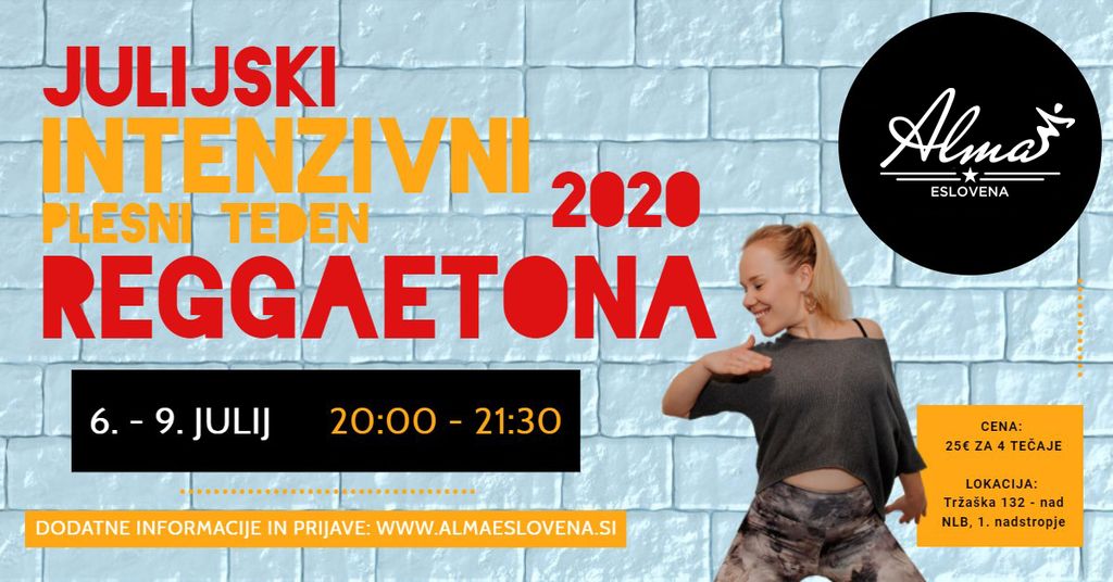Za vas smo pripravili PRVI SKLOP ALMA INTENZIVNIH TEČAJEV, katerega bomo otvorili z VROČIM REGGAETONOM. Z našo Nino se boste srečevali, migali in uživali v latino ritmih 4 dni zapored, vsak dan - od ponedeljka do četrtka.