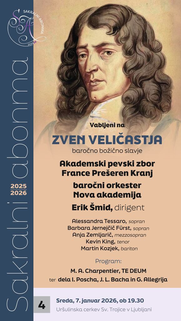 Ob začetku novega leta 2026 vas vljudno vas vabimo na koncert Sakralnega abonmaja s slavnostno baročno glasbo, ki bo zazvenela v izvedbi Akademskega pevskega zbora France Prešeren Kranj in baročnega orkestra Nova akademija pod vodstvom dirigenta Erika Šmida. Baročno božično slavje bodo dopolnili solisti: sopranistka Alessandra Tessaro, mezzosopranistki Barnara Jernejčič Fürst in Anja Zemljarič, tenorist Kevin King in baritonist Martin Kozjek.