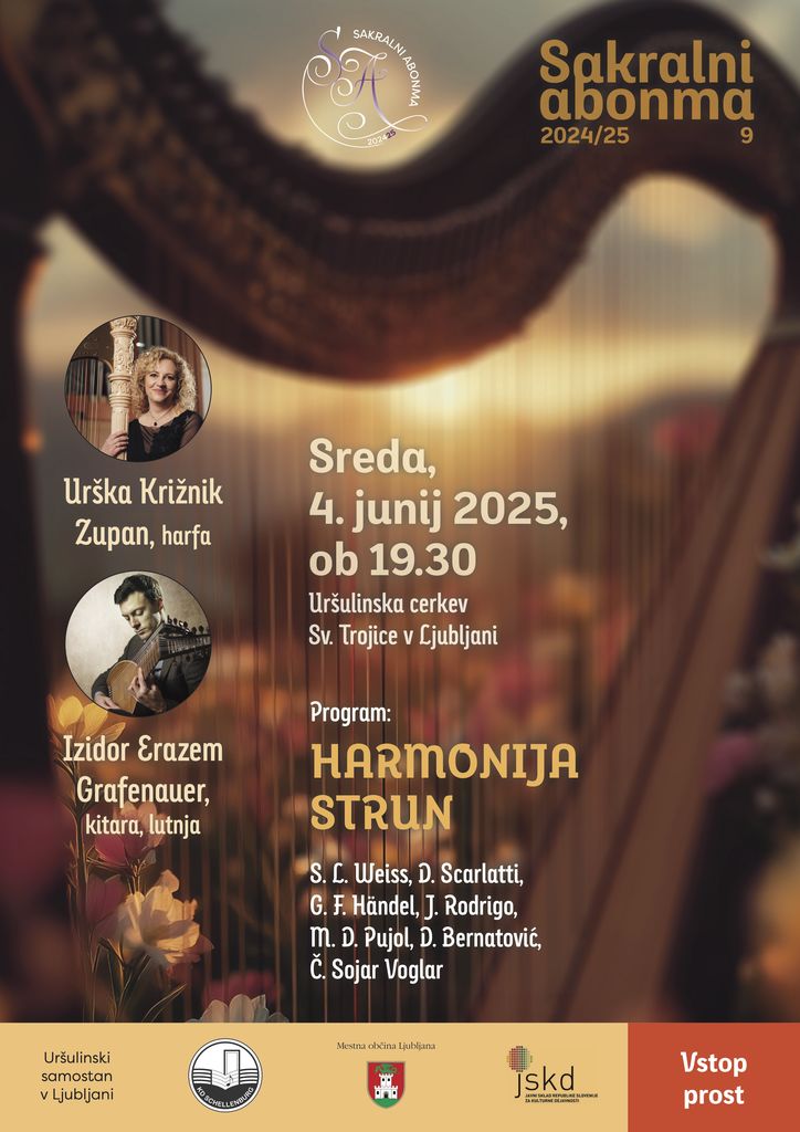 Vljudno vas vabimo na sklepni koncert letošnje sezone Sakralnega abonmaja. V prepletu baročne in sodobne glasbe bodo zazvenela dela za harfo, kitaro in lutnjo. V Harmonijo strun nas bosta popeljala harfistka Urška Križnik Zupan in kitarist Izidor Erazem Grafenauer.