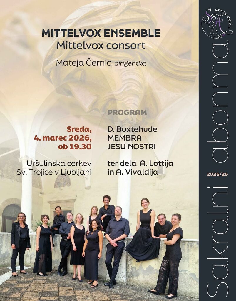Vljudno vas vabimo na koncert Sakralnega abonmaja, na katerem bomo prisluhnili presunljivi glasbeni meditaciji baročnega skladatelja Dietricha Buxtehudeja, ki je v delu Membra Jesu nostri upodobil križanega Kristusa, ter glasbi skladateljev Antonia Lottija in Antonia Vivaldija.